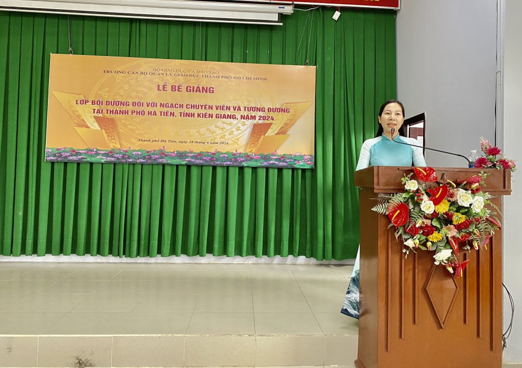 Thay mặt lớp, học viên Nguyễn Thị Mỹ Phượng – Phó Trưởng phòng giáo dục thành phố Hà Tiên đã gửi lời cảm ơn sâu sắc đến các thầy cô Trường Cán bộ quản lý giáo dục TP. Hồ Chí Minh vì đã tổ chức một khóa học thiết thực và ý nghĩa. Mỹ Phượng cho biết kiến thức và kỹ năng mà các học viên thu được từ khóa học sẽ góp phần nâng cao hiệu quả công tác quản lý và điều hành, đáp ứng tốt hơn các yêu cầu nhiệm vụ trong thời gian tới và xin hứa sẽ chủ động linh hoạt, vận dụng sáng tạo, có hiệu quả trong quá trình thực hiện nhiệm vụ tại cơ quan.